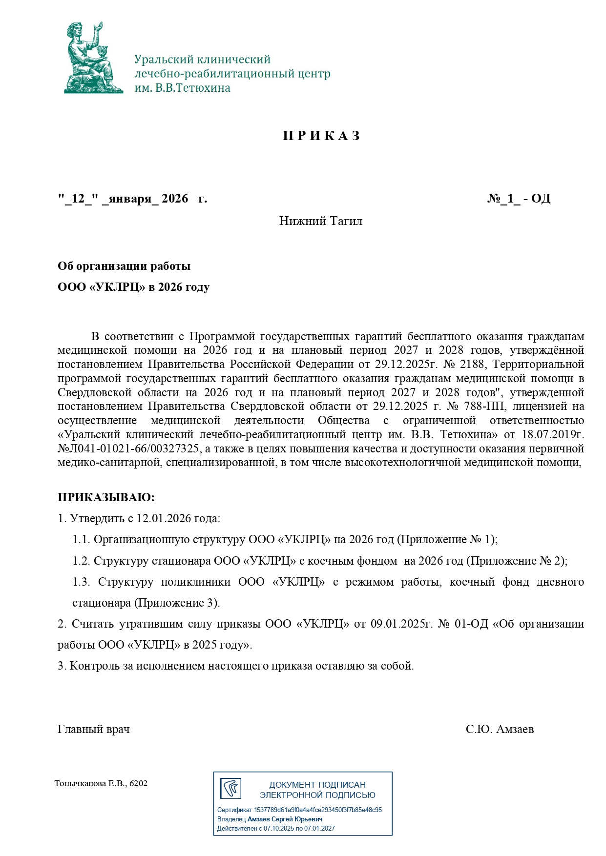 Приказ №1-ОД от 12.01.2026 г. Об организации работы ООО УКЛРЦ в 2026 году