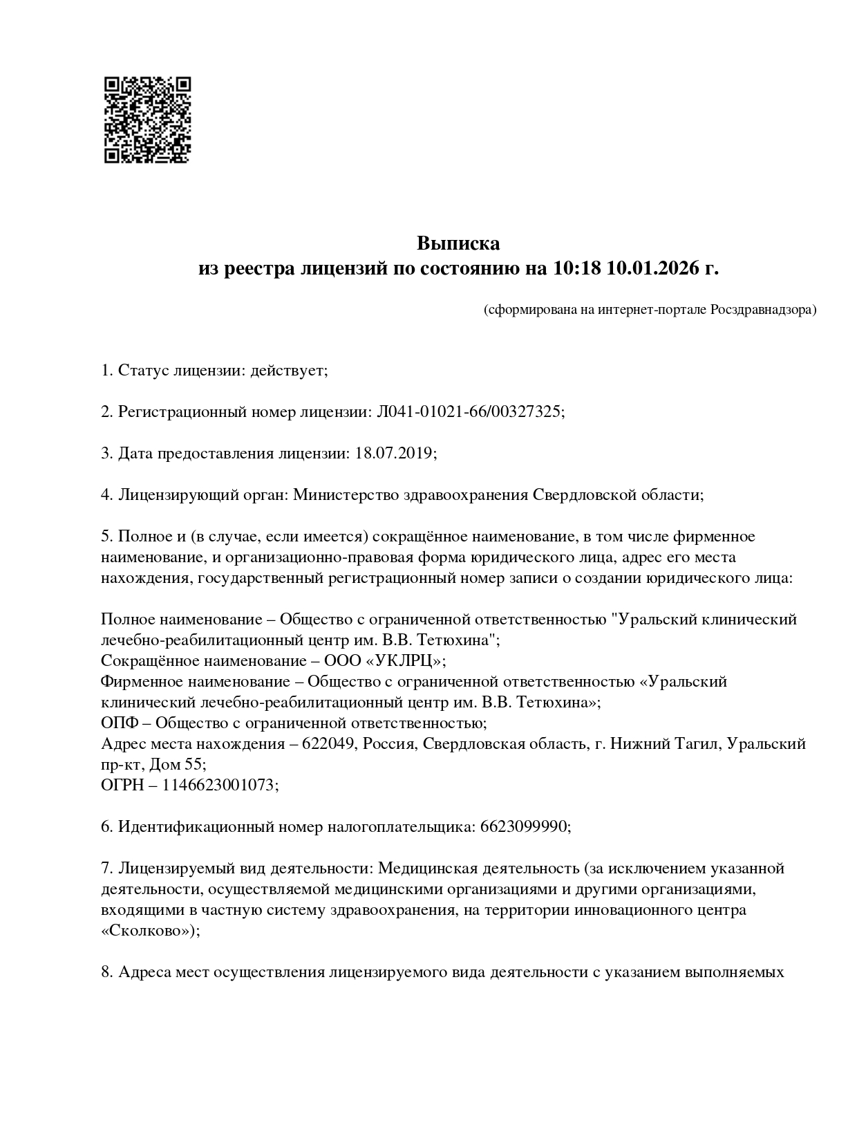 Выписка из реестра лицензий на 10.01.2026 г. Медицинская деятельность